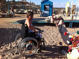 Mein Aktivfaltrollstuhl mit E-Fix Antrieb. Zum Anfang sicher eine gute Lösung, wenn man nicht mehr so lange laufen kann. Er lässt sich auch schnell ins Auto verfrachten, mit ins Flugzeug nehmen und für 4-5 Stunden auch durchaus bequem.