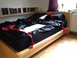 An meinem Bett habe ich in jeder Ecke Stricke befestigt, damit kann ich mich im Bett noch umdrehen, oder früher konnte ich mich damit auch noch aufrichten. Auf dem Bild ist auch noch mein Rutschbrett zu sehen, damit kann man mit ein wenig Kraft im Oberkörper sich gut von dem Rolli z.B. aufs Bett umsetzen.